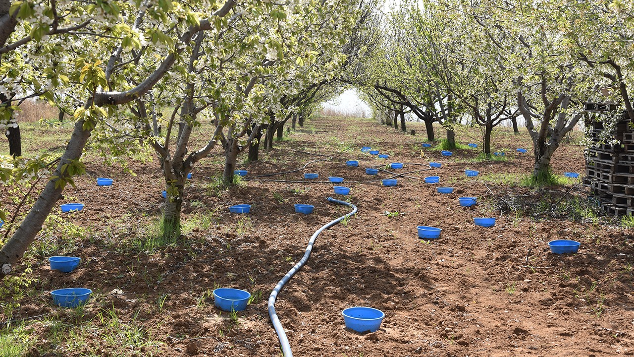 Kırıkkale'nin Bahşılı ilçesinde bir üretici, hem meyve ağaçlarını "bakla zınnı" zararlısına karşı korumak hem de bal arılarına zarar vermemek amacıyla ilaçlama yerine içi su dolu mavi plastik leğen kullanıyor.