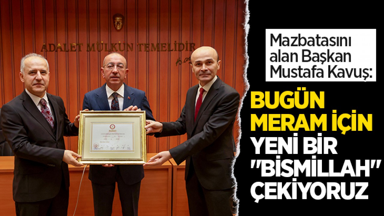 Konya Adliye Sarayı Konferans Salonu’nda Konya Büyükşehir Belediye Başkan Vekili ve yeni dönem Meram İlçe Meclis Üyesi Mustafa Uzbaş, AK Parti Meram İlçe Başkanı Mustafa Dolular ve MHP Meram İlçe Başkanı Mahmut Yaman’ın da katıldığı törende Başkan Kavuş mazbatasını Cumhuriyet Başsavcısı Halil İnal ve Meram 1. İlçe Seçim Kurulu Başkanı Hacı Süleyman Arslan’ın elinden aldı. İnal ve Arslan, Başkan Mustafa Kavuş’a yeni döneminde de başarılar dileyerek Meram’a hayırlı hizmetler yapması temennisinde bulundular. Başkan Kavuş ile birlikte yeni dönem meclis üyeleri de mazbatalarını aldılar. Mazbata töreninde yaptığı konuşmada, 37 meclis üyesiyle birlikte ‘Bismillah’ diyerek Meram için koşturmaya başladıklarını belirten Başkan Mustafa Kavuş, “Hangi partiden olursa olsun bugün rozetleri çıkardık, sadece ilçemizin geleceği için kardeşçe koşturmaya başlıyoruz. Hayırlı, mübarek olsun” diye konuştu.