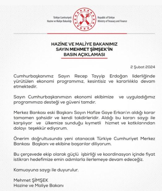 Merkez Bankası Başkanı Hafize Gaye Erkan, görevinden affını istemişti. İstifa sonrası Hazine ve Maliye Bakanı Mehmet Şimşek'ten açıklama gecikmedi.