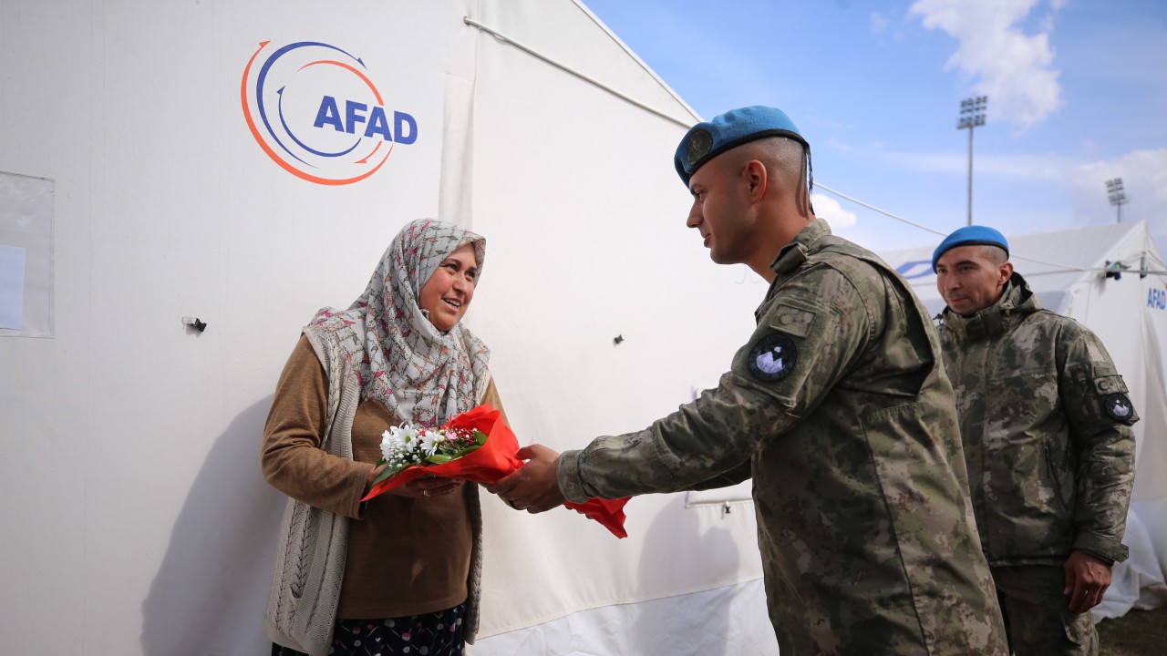 "Asrın felaketi" olarak nitelenen ve 11 ili etkileyen depremlerin merkez üssü Kahramanmaraş'ta Mehmetçik tarafından 8 Mart Dünya Kadınlar Günü dolayısıyla çadır kentteki kadınlara çiçek verildi.