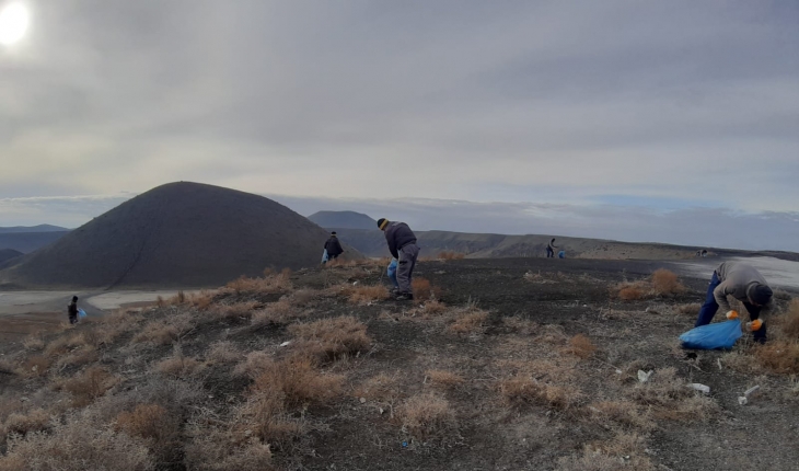 Meke Gölü ve çevresinin daha temiz ve güzel bir görüntüye kavuşması için temizlik işçileri, göl çevresine atılan şişeler, kağıt ve diğer atıkları çuvallarla toplandı.