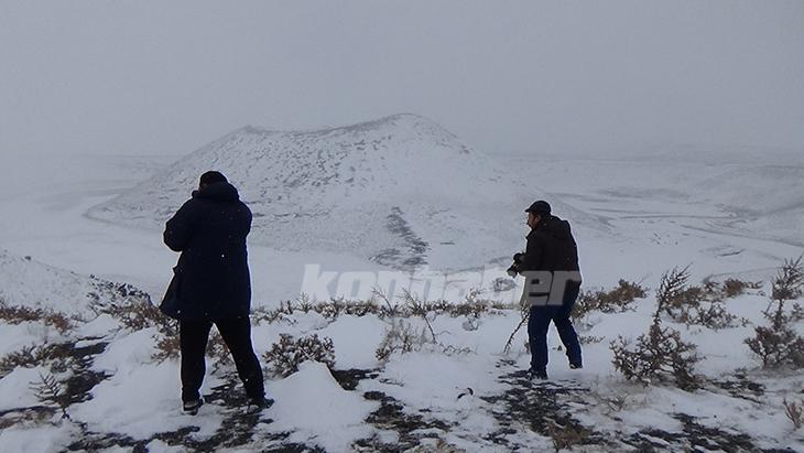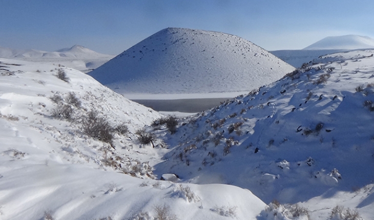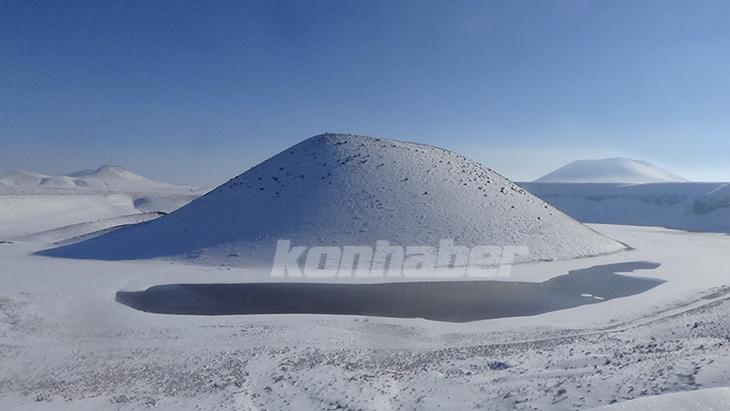 Konya'nın Karapınar ilçesindeki Meke Krater Gölü, bölgedeki yoğun kar yağışının ardından kartpostallık manzaralar oluşturdu.