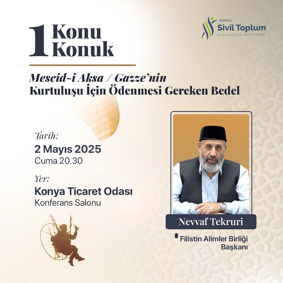 Konya Sivil Toplum Kuruluşları Platformu tarafından 2 Mayıs Cuma günü saat 20.30’da Konya Ticaret Odası Konferans Salonu’nda gerçekleştirilecek programda, Filistin davasının önde gelen isimlerinden olan Nevvaf Tekruri, Müslümanların Mescid-i Aksa ve Gazze için taşıdığı sorumluluklara dair önemli mesajlar verecek.