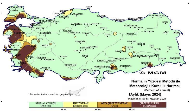 Meteoroloji Genel Müdürlüğü'nün mayıs ayı sıcaklık ve yağış raporları ve meteorolojik kuraklık haritalarına göre sıcaklığın normaline göre düştüğü, yağışların arttığı ve kuraklık haritasında da Türkiye'de son yılların en yeşil görüntüsü oluştu. Raporlara göre, mayıs ayında sıcaklık Kırklareli, Antakya, Karabük, Boyabat, Kızılcahamam, İspir, Doğubeyazıt çevrelerinde mevsim normallerinin altında yaşandı. Kuşadası, Aydın, Bodrum, Datça, Marmaris, Seferihisar, Isparta, Fethiye, Alanya, Anamur, Kaş, Senirkent, Eğirdir, Acıpayam, Köyceğiz, Manavgat, Kale-Demre, Gazipaşa ve Ceylanpınar çevrelerinde ise mevsim normallerinin üzerinde gerçekleşti.