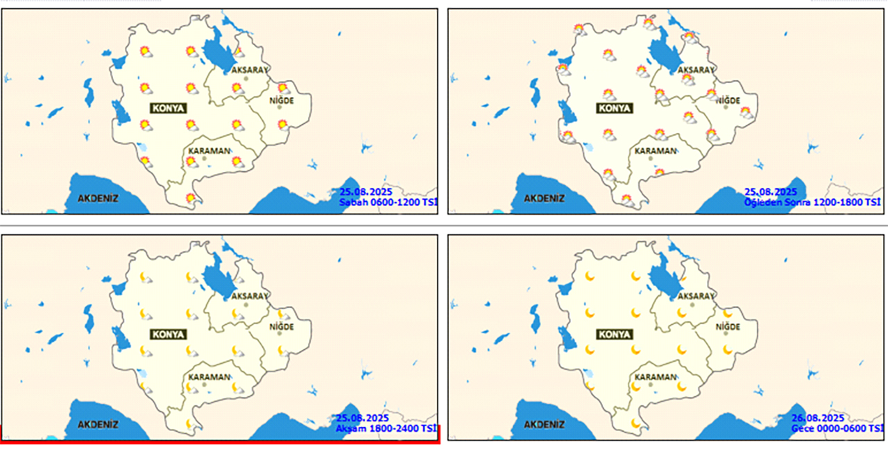 Meteorolojinin son hava tahmin raporuna göre hava sıcaklığının en yüksek 29 derece olması beklenen Konya'da havanın bugün (25 Ağustos Pazartesi) az bulutlu ve açık,öğleden sonra yer yer parçalı bulutlu geçeceği tahmin ediliyor. Hava sıcaklığının mevsim normalleri civarında seyretmesi beklenirken, rüzgarın ise gnellikle kuzeyli yönlerden hafif, ara sıra orta kuvvette ve yer yer kuvvetlice esmesi tahmin ediliyor.