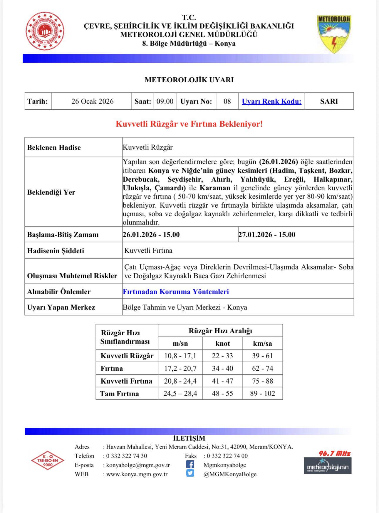 Meteorolojiden yapılan son değerlendirmelere göre, 26 Ocak 2026 Pazartesi günü saat 15.00’ten itibaren, Niğde (Ulukışla, Çamardı) ve Konya'nın güney kesimleri (Hadim, Taşkent, Bozkır, Derebucak, Seydişehir, Ahırlı, Yalıhüyük, Ereğli, Halkapınar) ile Karaman il genelinde güney yönlerden kuvvetli rüzgâr ve fırtına bekleniyor.