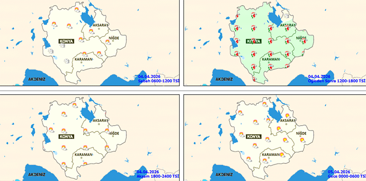 Meteorolojinin son hava tahmin raporuna göre hava sıcaklığının en yüksek 14 derece olması beklenen Konya'da havanın bugün (4 Nisan Cumartesi) parçalı ve çok bulutlu, öğle saatlerinden itibaren aralıklı ve yerel olmak üzere sağanak ve gök gürültülü sağanak yağışlı geçeceği tahmin ediliyor.