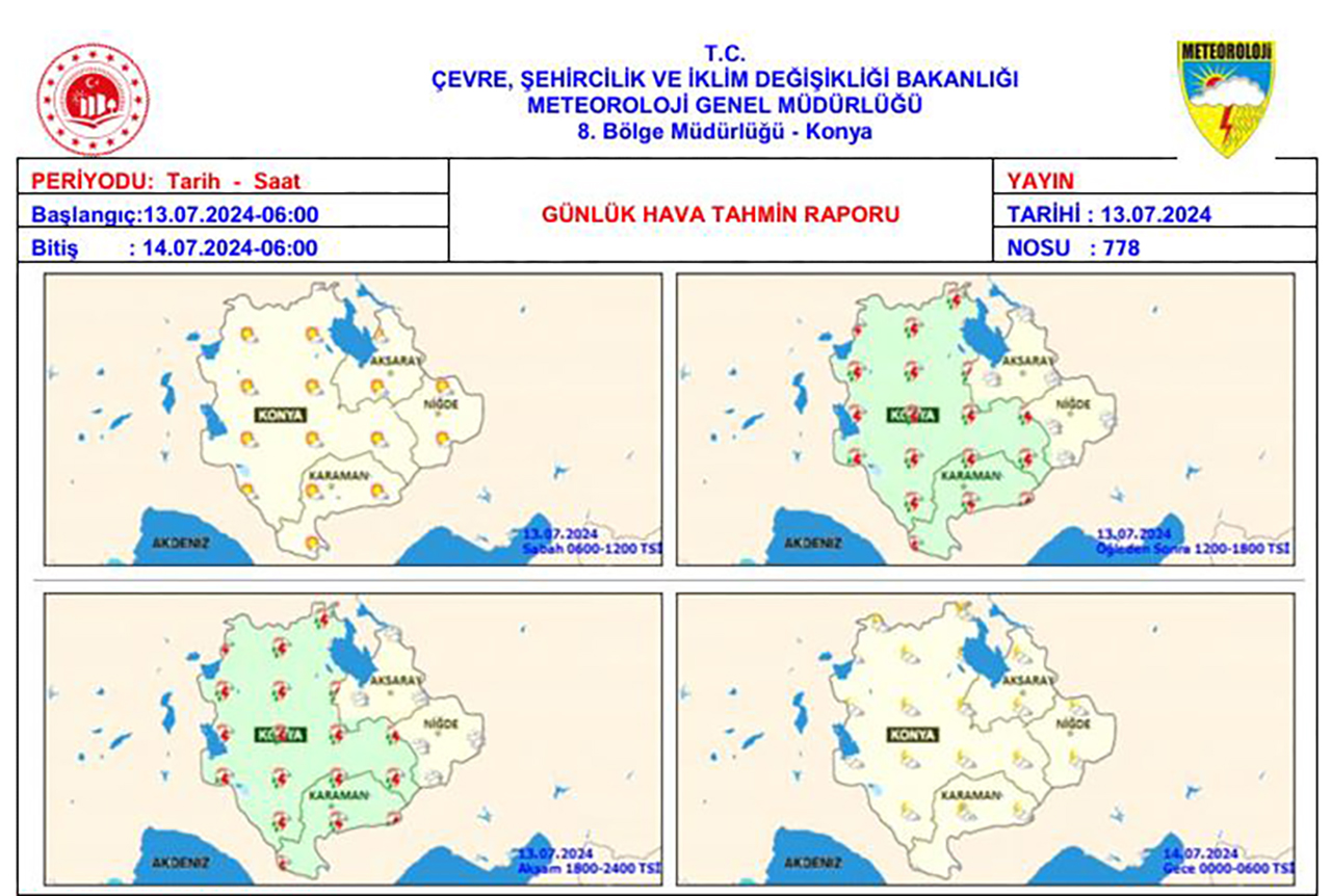 Meteoroloji 13 Temmuz hava durumu raporunda Konya ve çevresine yerel sağanak ve gök gürültülü sağanak yağış uyarısı yaptı. Yağışların öğlen saatlerinden sonra etkili olması bekleniyor.