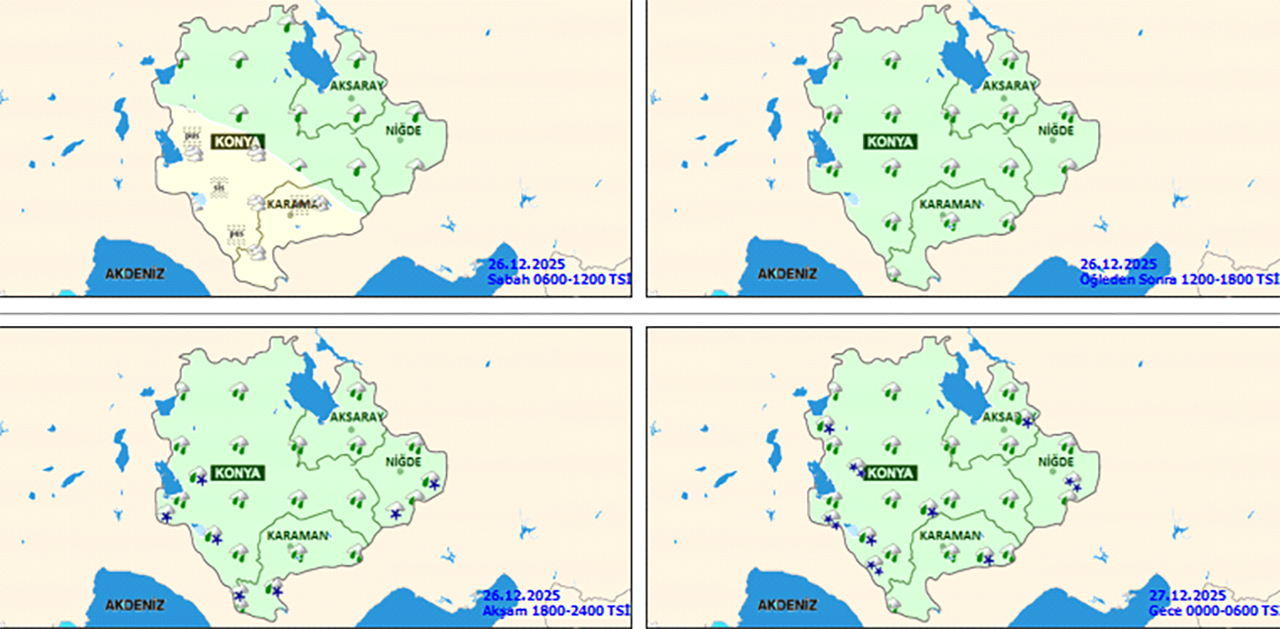 Meteorolojinin son hava tahmin raporuna göre hava sıcaklığının en yüksek 9 derece olması beklenen Konya'da havanın bugün (26 Aralık Cuma) parçalı ve çok bulutlu, aralıklı yağmurlu, yüksek kesimlerin karla karışık yağmur ve yer yer kar yağışlı geçeceği tahmin ediliyor.