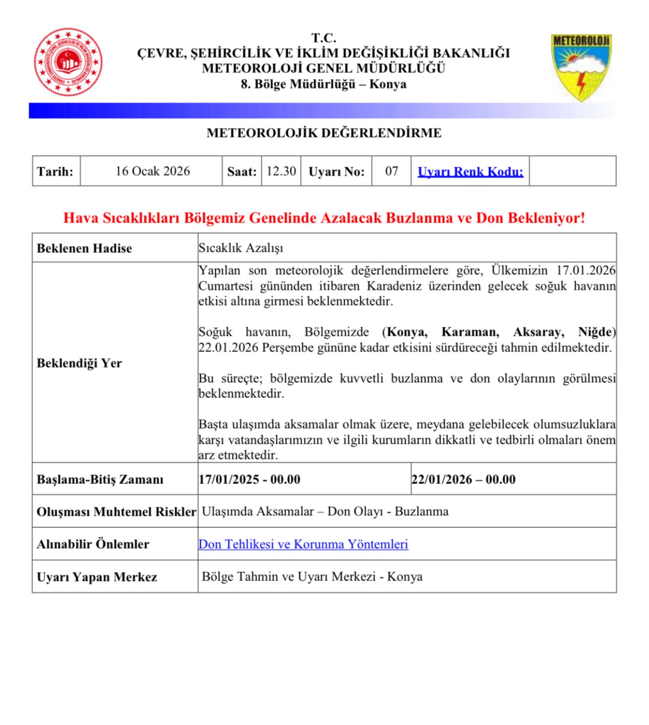 Konya, Karaman, Aksaray ve Niğde’yi kapsayan bölgede, özellikle gece ve sabah saatlerinde ulaşımda aksaklıklar ve tarımsal faaliyetlerde olumsuzluklar yaşanabileceği uyarısı yapıldı.