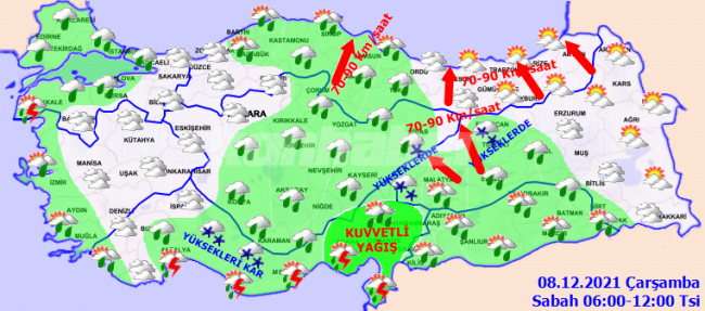 Gök gürültülü sağanak, Akdeniz'in Toroslar Mevkii, Tunceli, Bingöl, Muş, Siirt, Şırnak ve Hakkâri çevreleri ile Diyarbakır ve Batman'ın merkez ve kuzey, Elazığ'ın doğu ilçelerinde kuvvetli olacak. Bu illerde karla karışık yağmur, yüksek kesimlerinde ise yoğun kar yağışı şeklinde olması da tahmin ediliyor.