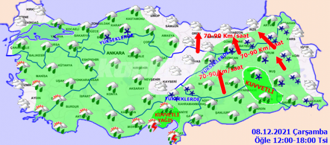Rüzgarın ise genellikle güneyli yönlerden hafif, ara sıra orta kuvvette, Orta ve Doğu Karadeniz’in iç kesimleri ile Doğu Anadolu'da güneyli yönlerden kuvvetli ve yer yer fırtına şeklinde esmesi bekleniyor.