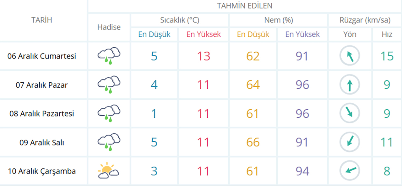 Hafta sonunun ikinci günü olan 7 Aralık Pazar günü ise yağışlı hava devam edecek ve sıcaklıklar bir miktar düşerek en yüksek 11 dereceye kadar gerileyecek.