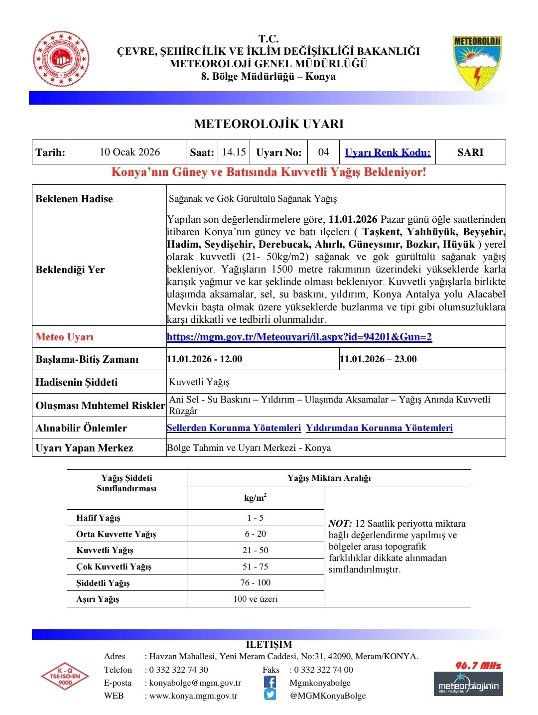 Meteorolojinin son hava tahmin raporuna göre 11 Ocak 2026 Pazar günü öğle saatlerinden itibaren Konya'nın güney ve batı ilçelerinde kuvvetli sağanak ve gök gürültülü sağanak yağış bekleniyor.