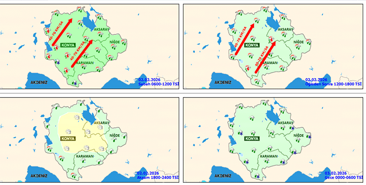 Meteoroloji Konya, Karaman, Aksaray ve Niğde'ye kuvvetli rüzgar uyarsında bulundu. Güney yönlerden kuvvetli rüzgâr ve fırtına (50–70 km/saat, yükseklerde yer yer 80 km/saat) şeklinde esmesi beklendiğinden, oluşabilecek olumsuzluklara karşı vatandaşların ulaşımda aksamalar, çatı uçması, ağaç devrilmesi, soba ve doğal gaz kaynaklı baca gazı zehirlenmesi gibi olaylarda dikkatli ve tedbirli olunması gerektiği belirtildi.