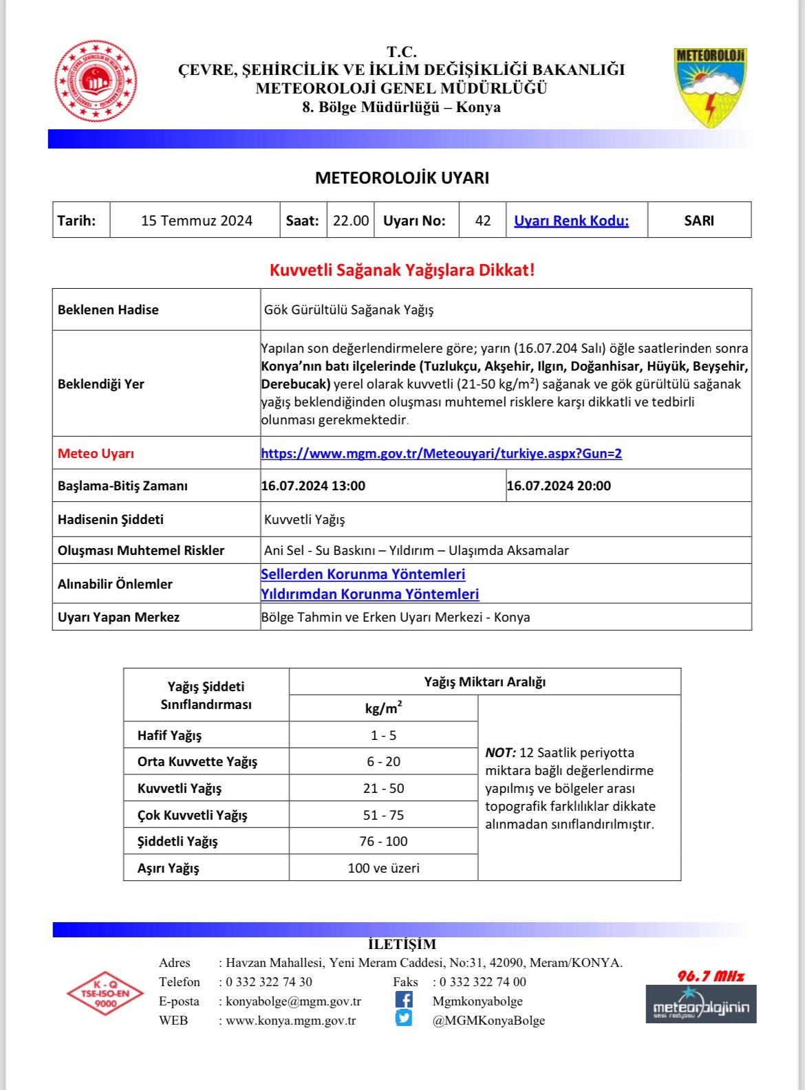 Meteoroloji Konya'da gök gürültülü sağanak uyarısında bulundu. Buna göre 16 Temmuz Salı (yarın) günü Konya'nın batı ilçelerinde (Tuzlukçu, Akşehir, Ilgın, Doğanhisar, Hüyük, Beyşehir, Derebucak) yerel olarak kuvvetli yağışın etkili olacağını duyurdu.