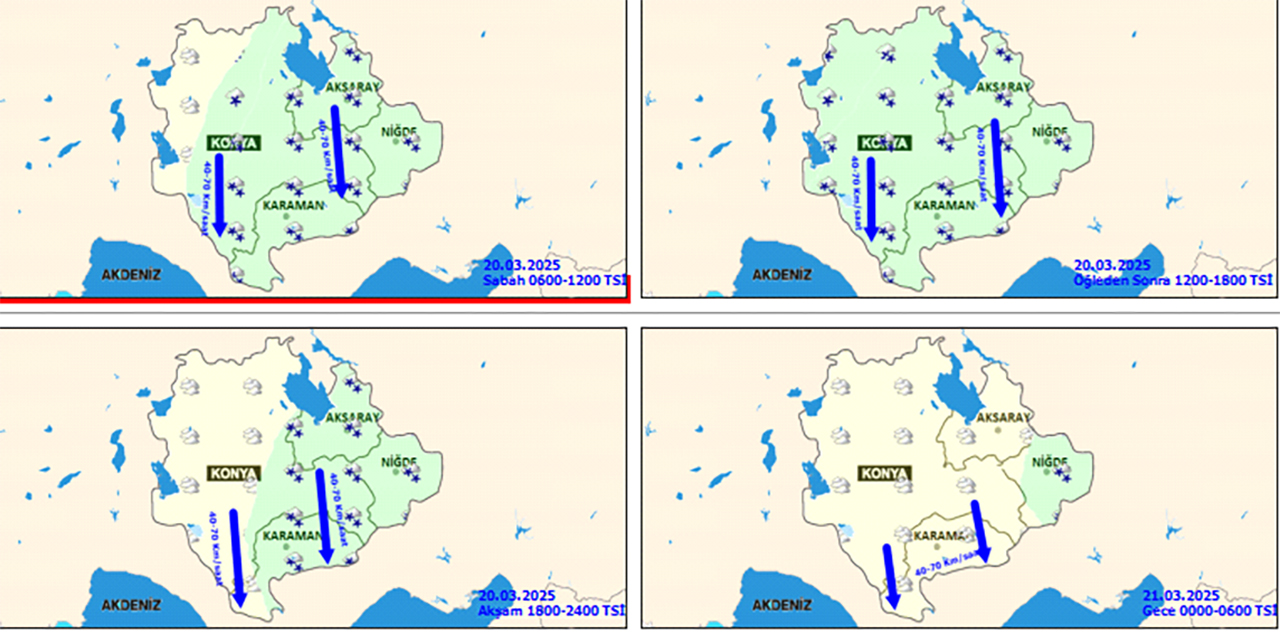 Meteorolojinin son hava tahmin raporuna göre bugün (20 Mart Perşembe) bölge genelinde (Konya, Karaman, Aksaray, Niğde) havanın çok bulutlu ve aralıklı kar yağışlı, bölgenin güneydoğu kesimlerinde yer yer kuvvetli olacağı tahmin ediliyor. Gece ve sabah saatlerinde buzlanma ve don olayı bekleniyor.