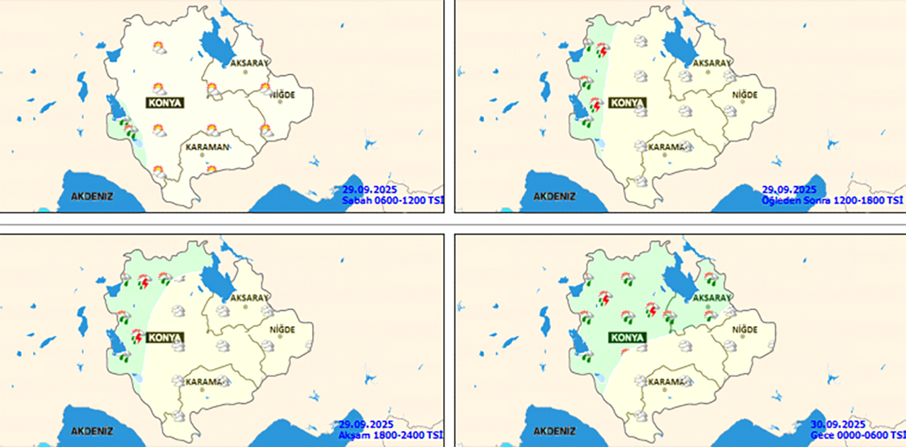 Konya: Parçalı ve çok bulutlu, Konya'nın kuzey ve batı kesimlerinin öğle saatlerinden sonra yerel olmak üzere sağanak ve gök gürültülü sağanak yağışlı geçeceği tahmin ediliyor. 27