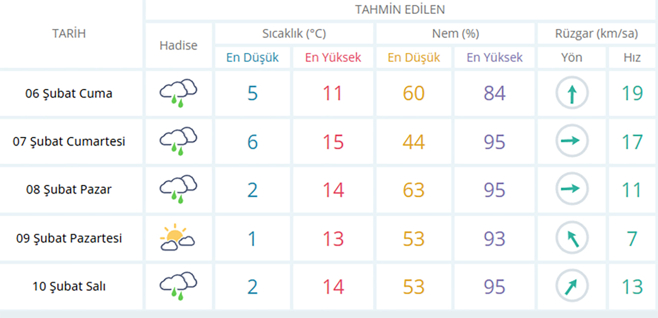 Meteoroloji verilerine göre 6–10 Şubat tarihleri arasında bölgede yağışlı hava etkili olacak. Cuma, cumartesi ve pazar günleri yağmur beklenirken, hafta başında parçalı bulutlu hava öne çıkıyor.