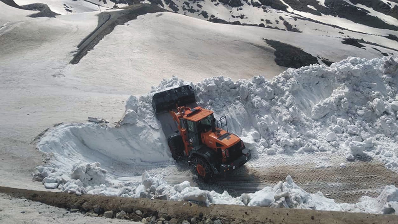 Karayolları 11. Bölge Müdürlüğü 117. Şube Şefliğine bağlı ekipler, mayısta da karla mücadeleye devam ediyor.Ekipler, Tekeli köyü yakınında bulunan 2 bin 807 rakımlı Mirgesav Üs Bölgesi'nin yolunu açmaya çalışıyor.