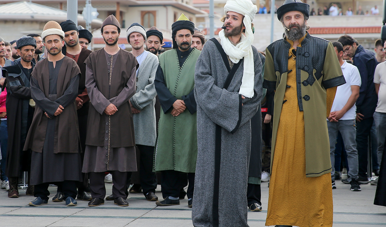 Konya Büyükşehir Belediyesince Mevlana Meydanı'nda düzenlenen "Teşrif-i Mevlana" etkinlikleri kapsamında, Mevlana ve ailesinin Konya'ya gelişi temsili olarak canlandırıldı.