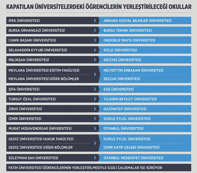 Rahmi Er, İpek Üniversitesi öğrencileri Ankara Sosyal Bilimler Üniversitesine, Bursa Orhangazi Üniversitesi öğrencileri Bursa Teknik Üniversitesine, Canik Başarı Üniversitesi öğrencileri Ondokuz Mayıs Üniversitesine, Selahaddin Eyyubi Üniversitesi öğrencileri Dicle Üniversitesine, Melikşah Üniversitesi öğrencileri Erciyes Üniversitesine, Mevlana Üniversitesi Eğitim Fakültesi öğrencileri Necmettin Erbakan Üniversitesine, Mevlana Üniversitesinin diğer bölümlerdeki öğrencileri Selçuk Üniversitesine, Şifa Üniversitesi öğrencileri Ege Üniversitesine, Turgut Özal Üniversitesi öğrencileri Yıldırım Beyazıt Üniversitesine, Zirve Üniversitesi öğrencileri Gaziantep Üniversitesine, İzmir Üniversitesi öğrencileri Dokuz Eylül Üniversitesine, Murat Hüdavendigar Üniversitesi öğrencileri İstanbul Üniversitesine, Gediz Üniversitesi Hukuk Fakültesi öğrencileri Dokuz Eylül Üniversitesine, Gediz Üniversitesinin diğer bölümlerdeki öğrencileri İzmir Katip Çelebi Üniversitesine, Süleyman Şah Üniversitesi öğrencileri İstanbul Medeniyet Üniversitesine yerleştirecek.