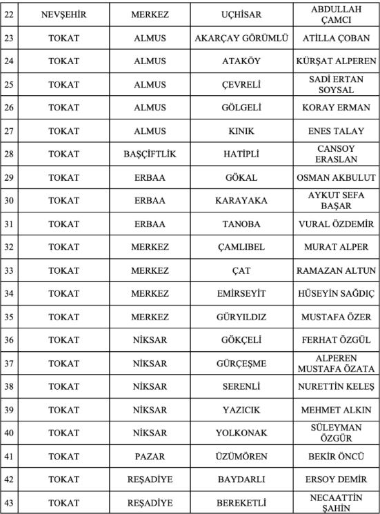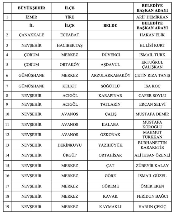 Bu kapsamda İzmir Tire'de Arif Demirkan, Çanakkale Eceabat'ta Hakan Elik, Nevşehir Hacıbektaş'ta ise Hulisi Kurt'u aday gösteren MHP, Çorum, Gümüşhane, Nevşehir, Tokat ve Osmaniye'deki bazı beldelerde de adaylarını açıkladı.