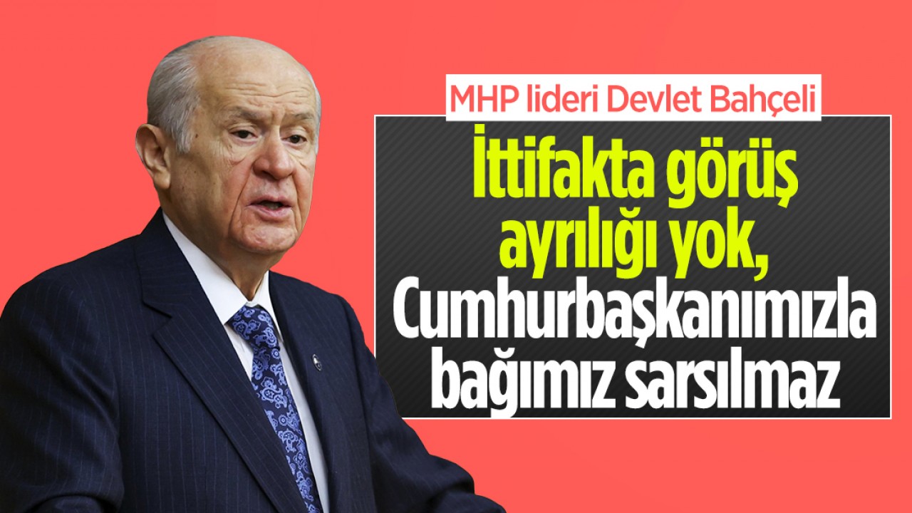 Parti grubunda gündemdeki konulara ilişkin değerlendirmelerde bulunan MHP lideri Devlet Bahçeli, Cumhurbaşkanı Erdoğan'la aralarında görüş ayrılığı olduğu iddialarını kesin bir dille reddederek "İttifakta görüş ayrılığı yok, Cumhurbaşkanımızla bağımız sarsılmaz" dedi.