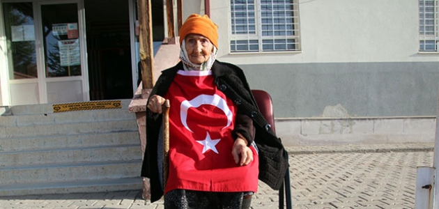 "Her yaşta, aynı heyecanda buluşmak ne büyük mutluluk... Fotoğraf, Sivas'tan. 96 yaşındaki Fermude Cangül annemiz, bayrağıyla koşmuş okul bahçesine. 'Töreni duyar duymaz heyecanla bekledim.' diyor. Kendisiyle ilk bayrak töreninde yan yana saygı duruşunda bulunmayı diliyorum."