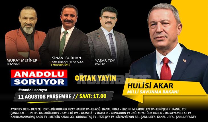 Milli Savunma Bakanı Hulusi Akar, Anadolu Yayıncılar Derneği tarafından gerçekleştirilen “Anadolu Soruyor” programının canlı yayın konuğu olacak.