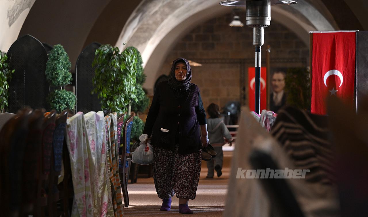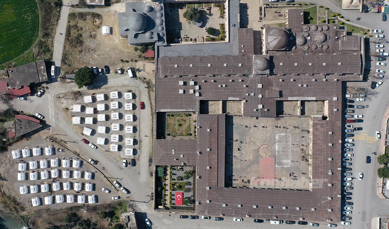 Kervansarayın geniş avlusu, etrafında kervanların ve yolcuların geceyi geçirdikleri kubbeli odalar ile külliyenin dışında kurulan çadırlarda yaklaşık 350 depremzede barınıyor.