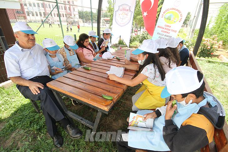 Konya'da, ilkokul öğrencileri okul bahçesinde kurulan serada ata tohumlarından elde ettikleri fidelerle, damla sulama yöntemiyle tarım ürünleri yetiştiriyor.