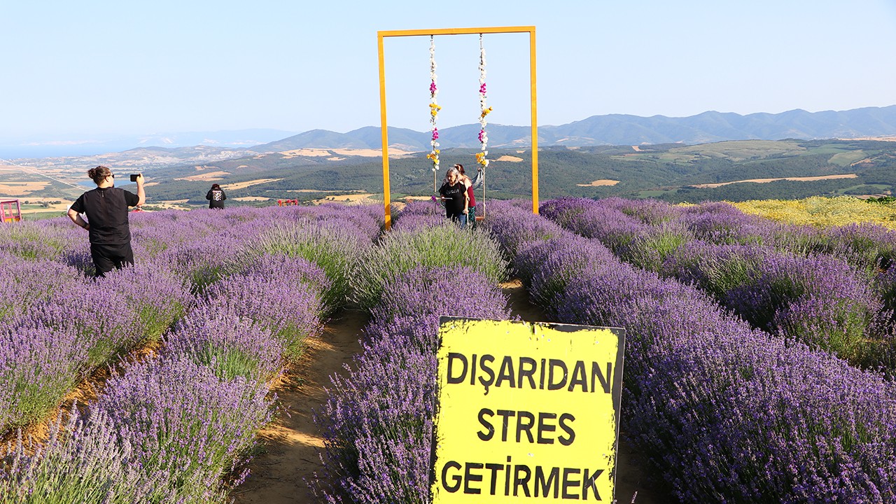 Göz alıcı mor ve eflatun renkleriyle misafirlerini ağırlayan tarlalarda, ziyaretçiler hazırlanan özel dekorlar önünde de en güzel fotoğraf karesini yakalamaya çalışıyor.