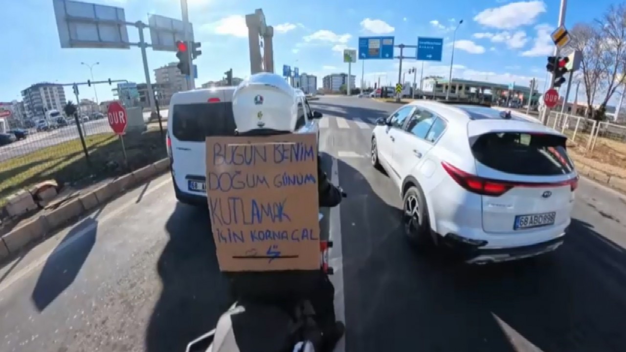 Aksaray'da doğum gününde kartona, “Bugün benim doğum günüm, kutlamak için korna çal” yazıp sırtına asan motosiklet sürücüsü trafikte görenleri gülümsetti. Trafikteki sürücülerin uzun uzun korna çaldığı, motosiklet sürücüsünün de mutluluktan kahkahalarla güldüğü o anlar aksiyon kamerasıyla görüntülendi.