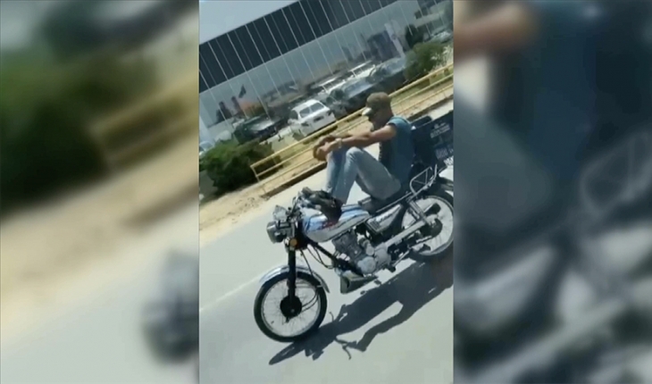 Adana'nın merkez Seyhan ilçesinde bir kişinin motosikletin direksiyonunu ayağıyla kontrol etmesi cep telefonu kamerasıyla görüntülendi.