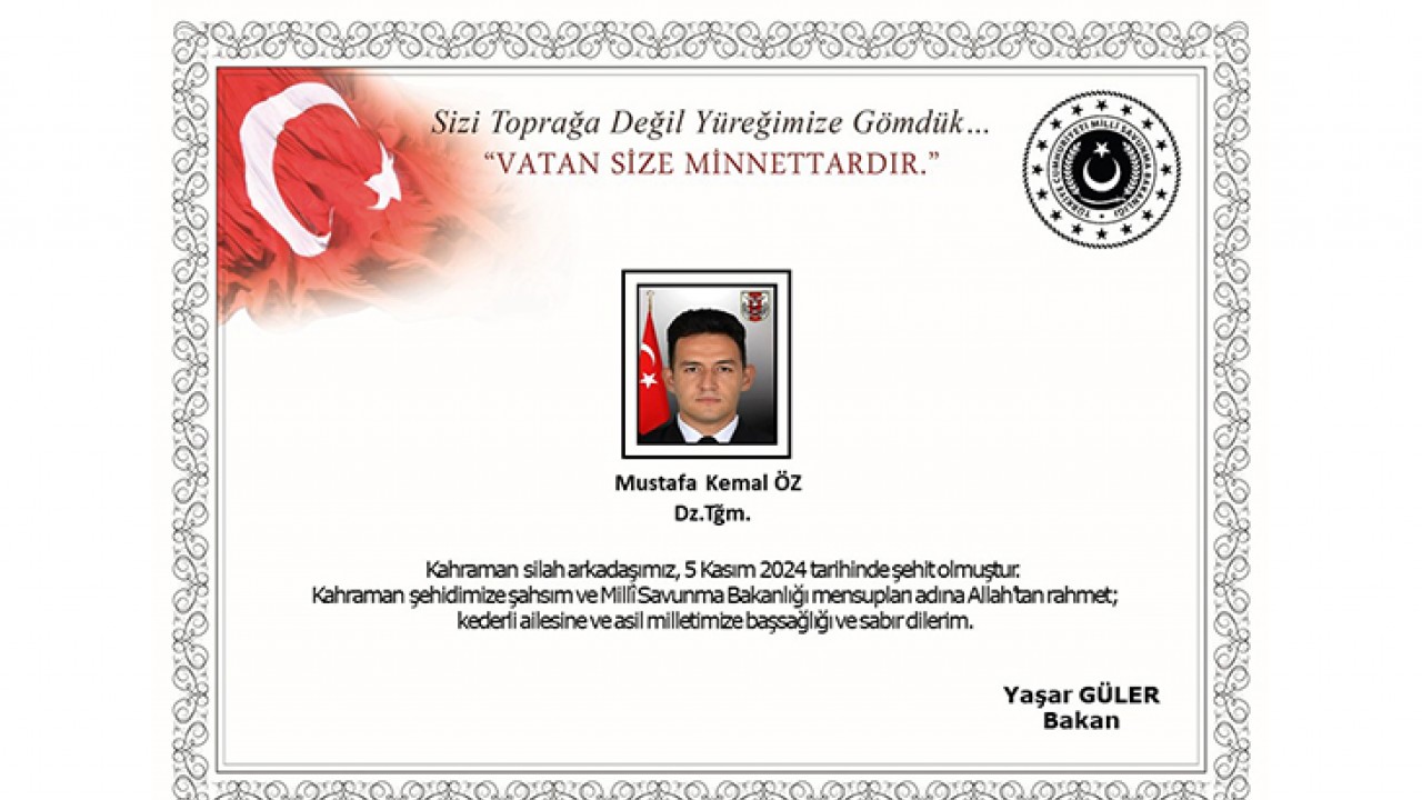 Milli Savunma Bakanlığı 5 Kasım 2024 tarihinde meydana gelen kaza sonucunda yaralanan Dz.Tğm. Mustafa Kemal Öz'ün, kaldırıldığı hastanede yapılan tüm müdahalelere rağmen kurtarılamayarak şehit olduğunu duyurdu.