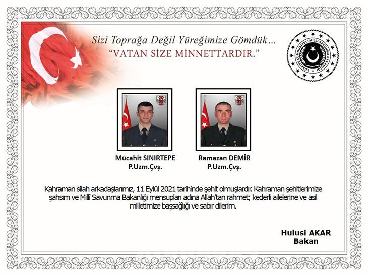 Milli Savunma Bakanlığı, İdlib Gerginliği Azaltma Bölgesi'nde 11 Eylül'de arama/tarama faaliyeti sonrasında yapılan saldırı sonucunda 2 askerin şehit olduğunu açıkladı.