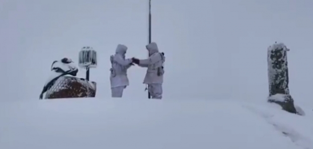 Milli Savunma Bakanlığı sosyal medya hesabından, Hakkari Çukurca'da bulunan karla kaplı Stine Üs Bölgesinde askerlerin bayrak değişimi sırasında çekilen görüntüsünü paylaştı.