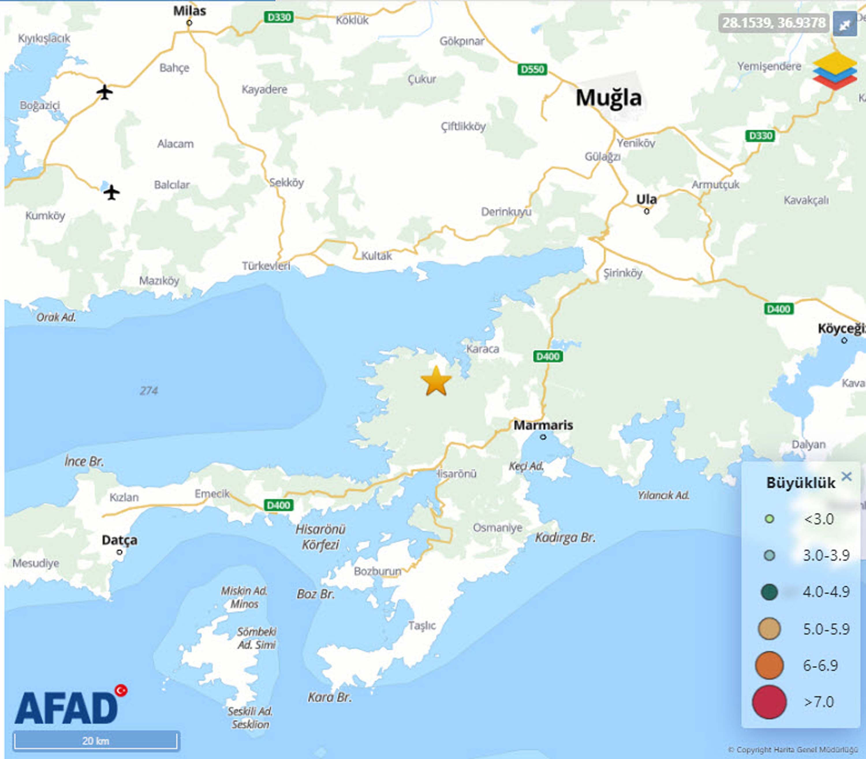 Afet ve Acil Durum Yönetimi Başkanlığının (AFAD) internet sitesinde yer alan bilgiye göre, Muğla'nın Marmaris ilçesinde saat 12.11'de 4,4 büyüklüğünde deprem kaydedildi. Deprem, yerin yaklaşık 6,89 kilometre derinliğinde gerçekleşti.