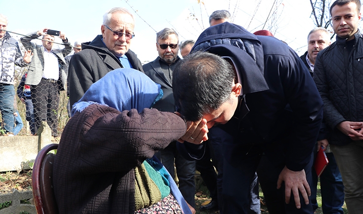 Dün Gölyaka'da ağır hasar gören 4 katlı apartmanın yıkım çalışmasına katılan Bakan Kurum, daha sonra evi ağır hasar gören 87 yaşındaki Zülfiye Yıldırım'ı da ziyaret etti.