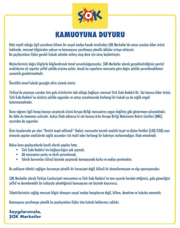 "ŞOK Marketler tarafından yapılan açıklamada, söz konusu ürünün, mevzuatta tanımlı analitik tespit ve ölçüm limitleri (LOD/LOQ) esas alınarak analizlerinin yapıldığı, sağlık açısından risk teşkil eden herhangi bir kalıntıya rastlanmadığı ifade edildi."
