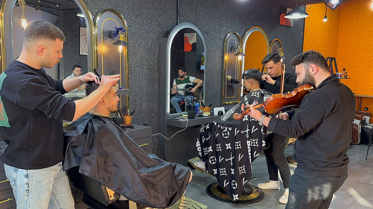 Bursa’nın İznik ilçesinde, erkek kuaförüne tıraş olmak için gelen ve sıra beklerken prova yapan müzisyenler büyük ilgi görünce, işletme sahibi müzik eşliğinde müşterilerini tıraş etmeye başladı. Aynı zamanda müşterisi olan müzisyenlerle, haftanın bir günü, kuaför dükkanında çalışmaları için anlaşan Halil İbrahim Katılmış (27), müşterilerini keman, gitar, klarnet ve darbuka eşliğinde tıraş ediyor.