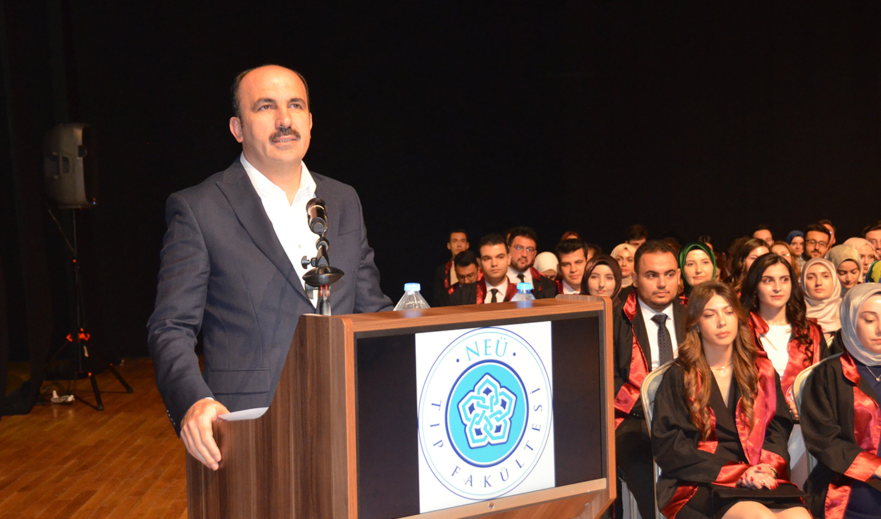 Selçuklu Kongre Merkezi'nde gerçekleştirilen törene Konya Büyükşehir Belediye Başkanı Uğur İbrahim Altay, NEÜ Rektörü Prof. Dr. Cem Zorlu, NEÜ Rektör Yardımcıları Prof. Dr. Bahadır Feyzioğlu ve Prof. Dr. Hidayet Oğuz, NEÜ Tıp Fakültesi Dekanı Prof. Dr. Şükrü Nail Güner, NEÜ Tıp Fakültesi Hastanesi Başhekimi Doç. Dr. Hasan Küçükkendirci, NEÜ yöneticileri, akademisyenler, mezun öğrenciler ve aileleri katıldı.