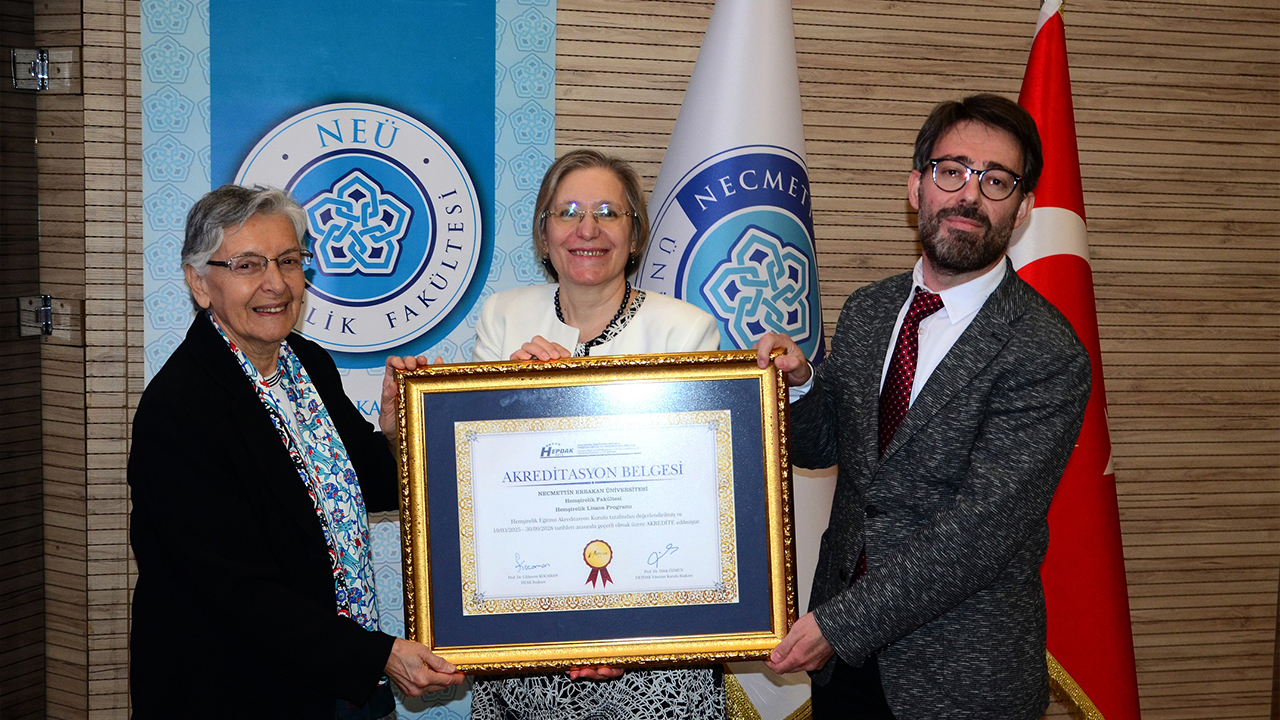 12 Mayıs Hemşireler Günü’nü kutlayarak konuşmasına başlayan Hemşirelik Eğitim Programları Değerlendirme ve Akreditasyon Derneği Hemşirelik Eğitimi Akreditasyon Kurulu Üyesi Prof. Dr. Emine Ümit Seviğ de, “2 yıl önce başarılı çalışmalarınızın neticesi olarak elde ettiğiniz akreditasyon mutluluğunu sizinle yaşama fırsatı bulmuştum. Ara değerlendirme sonrasında elde ettiğiniz artı 3 yıllık akreditasyonunuza da şahitlik etmekten sonra derece memnunum. Bu belge, toplum sağlığını koruyan, gelişmesini sağlayan, güvenli, etkili ve nitelikli bakım veren hemşireler yetiştirildiğinin belgesi. Akreditasyon, eğitimin kalitesini güvenceye almak üzere eğitim süreçlerinin iyileştirilmesine yardımcı olmaktır. Öğrencileri, kurumları ve toplumu destekleyen bir uygulamadır. Bir programın akredite olması, onun kalitesini ve etkinliğini gösterir. Akreditasyon çalışmaları öğrenci ve mezunların güçlenmesini sağlar. Dolayısıyla sağlık sistemine güvenli ve nitelikli hemşireler yetiştirilmesini desteklemesi nedeniyle de akreditasyonun en önemli yararı toplumadır. Necmettin Erbakan Üniversitesi Hemşirelik Fakültesi, eğitime başladığı yıldan itibaren çağdaş ve kaliteli eğitimin öncülüğünü yaptığını 2 yıl süreyle akredite edilmesinin ardından ekip olarak kararlı çalışmalarla, iyileştirilmesi gereken alanları kısa sürede tamamlamasıyla gösterdi. Sizler akreditasyon gerekliliklerini yerine getirerek eğitimde mükemmelleşmenin kurumsallaşması konusunda çok önemli bir adım attınız” ifadelerini kullandı.