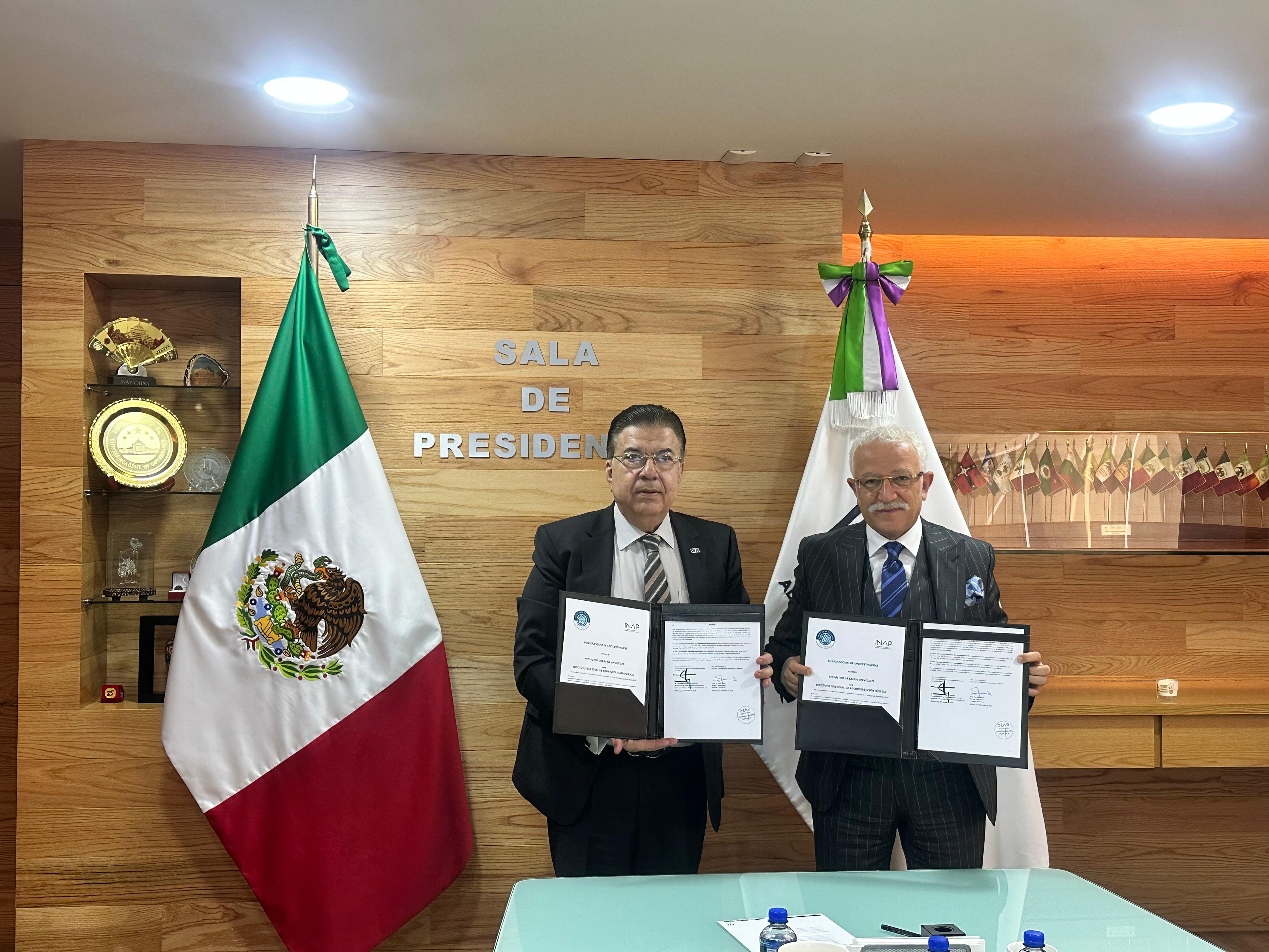 NEÜ Rektörü Prof. Dr. Cem Zorlu ve beraberindeki heyet, Meksika programı kapsamında ilk olarak Meksika’nın önde gelen eğitim ve yönetim kurumlarından biri olan Meksika Ulusal Kamu Yönetimi Enstitüsü (Instituto Nacional de Administración Pública / INAP) Başkanı Dr. Luis Miguel Martinez Anzures’i ziyaret etti. Gerçekleştirilen ziyarette NEÜ ile Meksika Ulusal Kamu Yönetimi Enstitüsü arasında Erasmus+ KA171 Programı çerçevesinde, öğrenci ve akademik personel değişimi, ortak projeler ve eğitim programları gibi çeşitli iş birliği olanakları ele alındı. Görüşmelerin ardından iki kurum arasında akademik ve idari iş birliğini güçlendirmek amacıyla “İş Birliği Anlaşması” imzalandı.