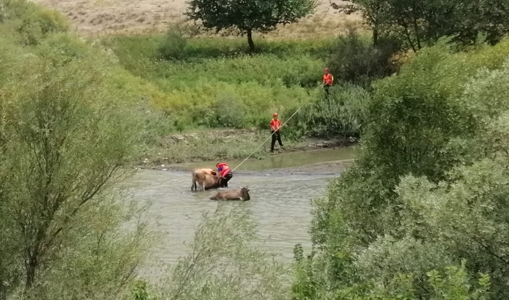 Pekmezli köyü bölgesinde iki ineğinin Karasu Nehri kenarında oluşan çamurda mahsur kaldığını gören besici, 112 Acil Çağrı Merkezi'ni arayarak yardım istedi. Bölgeye giden AFAD ekipleri, şişme bot yardımı ile büyükbaş hayvanların olduğu yere ulaştı. Ekipler, burada mahsur kalan hayvanları ip yardımıyla kurtardı.