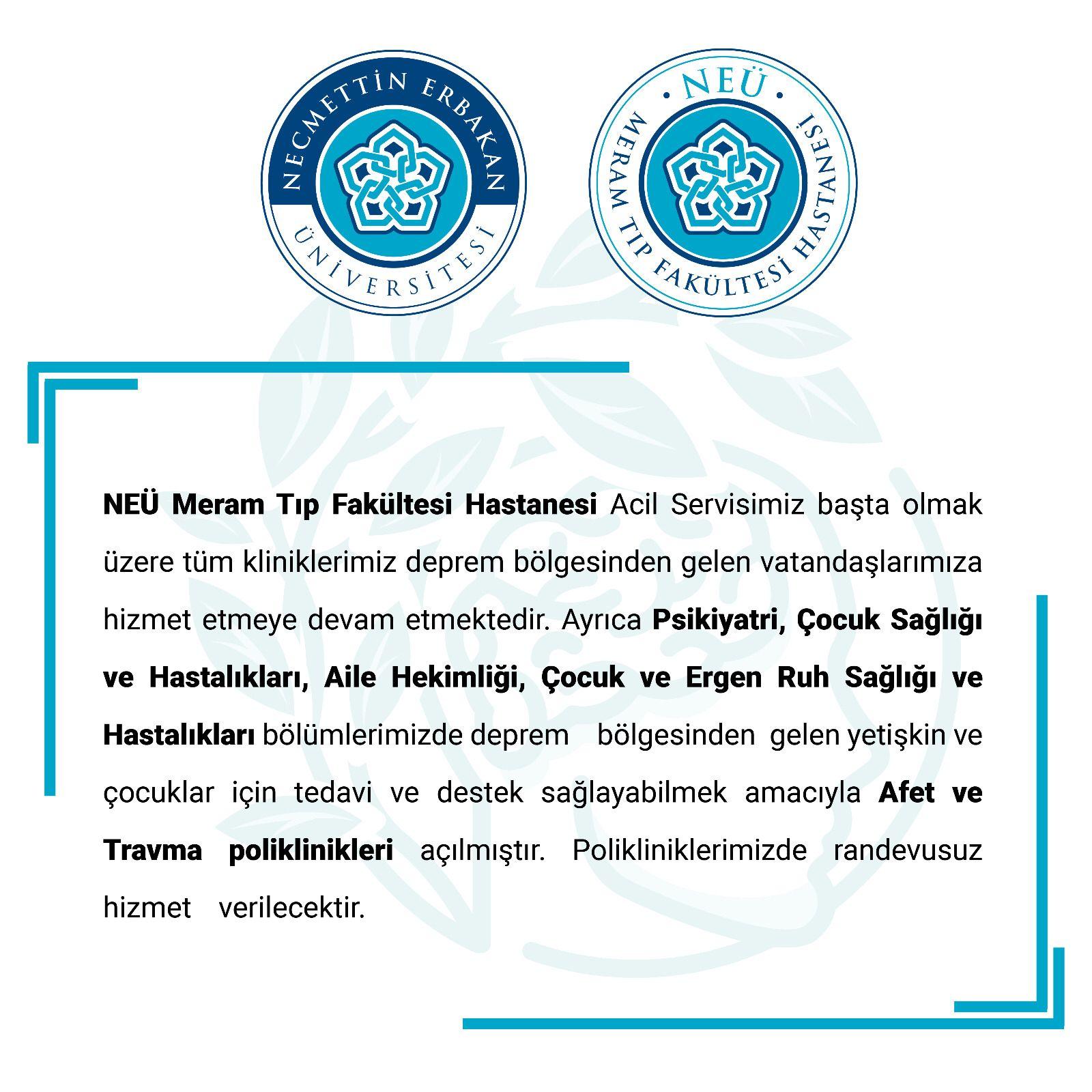 NEÜ Meram Tıp Fakültesi Hastanesi tarafından yapılan açıklamada: 'Acil servisteki vatandaşlar başta olmak üzere tüm klinikler deprem bölgesinden gelen vatandaşlara hizmet etmektedir. Ayrıca Psikiyatri, Çocuk Sağlığı ve Hastalıkları, Aile Hekimliği, Çocuk ve Ergen Ruh Sağlığı ve Hastalıkları bölümlerinden deprem bölgesinden gelen yetişkin ve çocuklar için tedavi ve destek