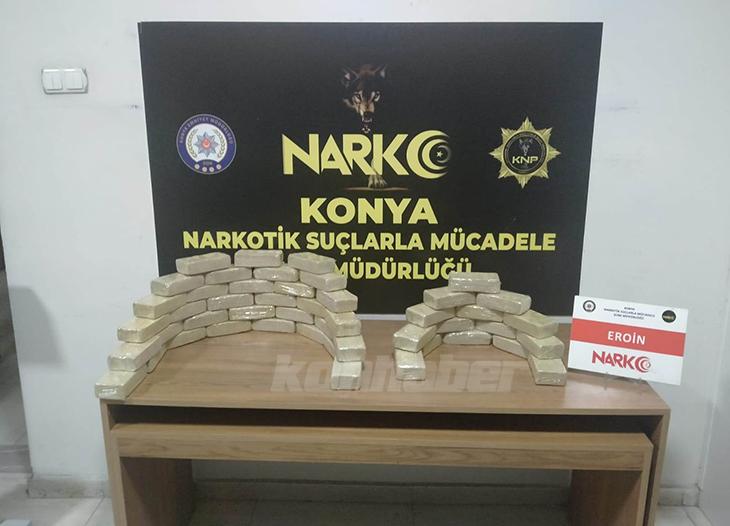 Konya'da polis ekiplerinin uygulama noktasından kaçtıktan sonra 60 kilometrelik takip sonucu yakalanan sürücünün aracında yaklaşık 25 kilogram eroin ele geçirildi. Bir şüpheli tutuklandı.