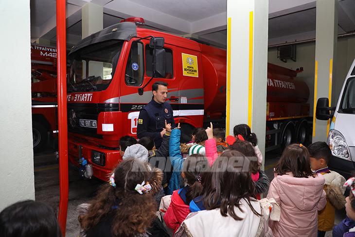 Konya Büyükşehir Belediyesi İtfaiye Eğitim Merkezi’nde düzenlenen eğitimlerde minik öğrenciler, günlük hayatta karşılaşabilecekleri yangın ve benzeri afetler konusunda bilinç kazanırken sevdikleri itfaiyecilerle vakit geçirmenin mutluluğunu yaşıyor.