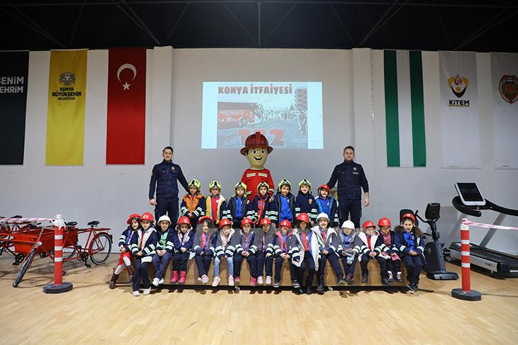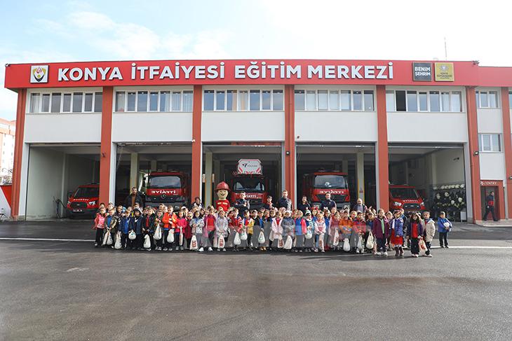 Konya Büyükşehir Belediyesi, Medeniyet Okulu Projesi kapsamında ilkokul birinci sınıf öğrencilerine yönelik itfaiye eğitimleri düzenliyor.